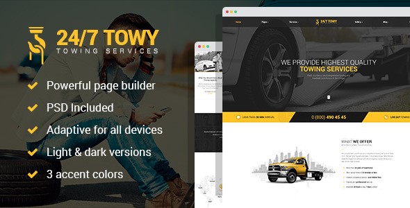 Towy is our latest WordPress theme, designed for auto towing companies, car assistance, repair or car breakage services.