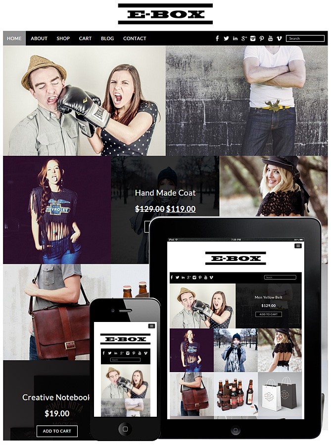 E-Box Woocommerce Responsive WordPress Theme is great theme for any ecommerce shop, with clean design and minimal layout. E-Box ecommerce theme has minimalist style and mobile friendly design.