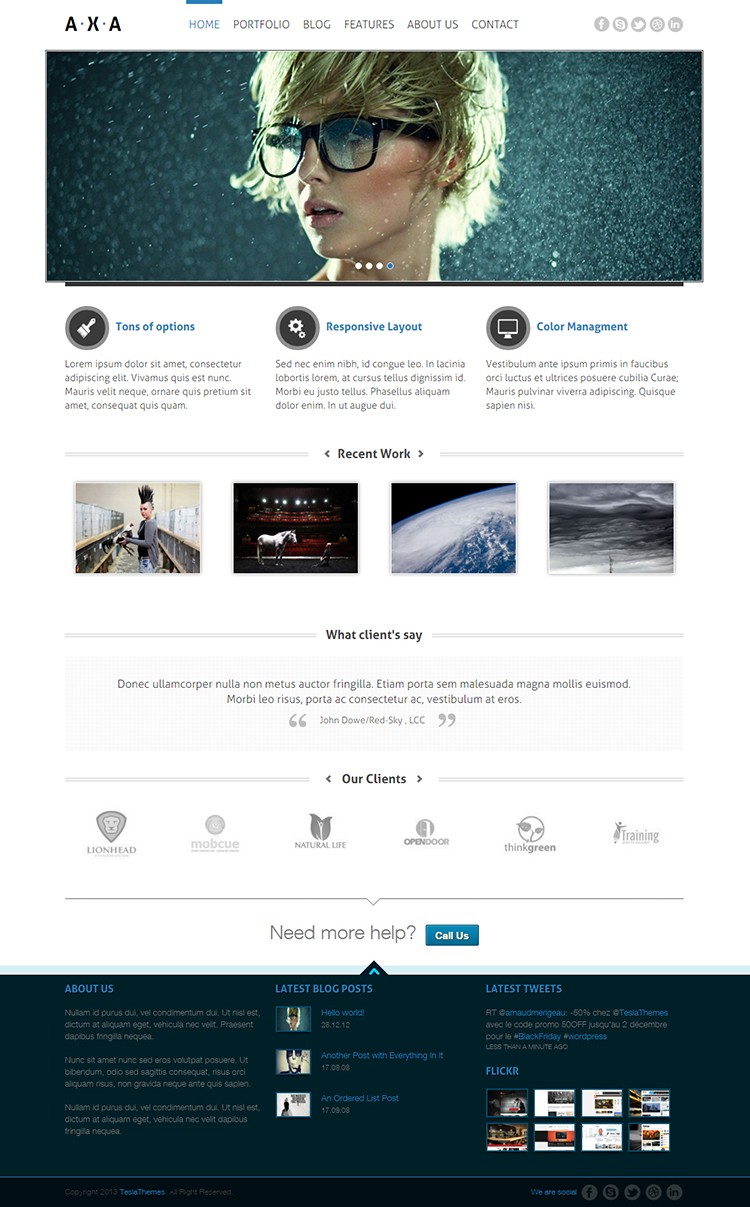 Flickr Gallery – integrate your Flickr photostream directly on this design. Simply paste your Flickr ID, select the number of pictures to display and let the visitors see your great pictures.