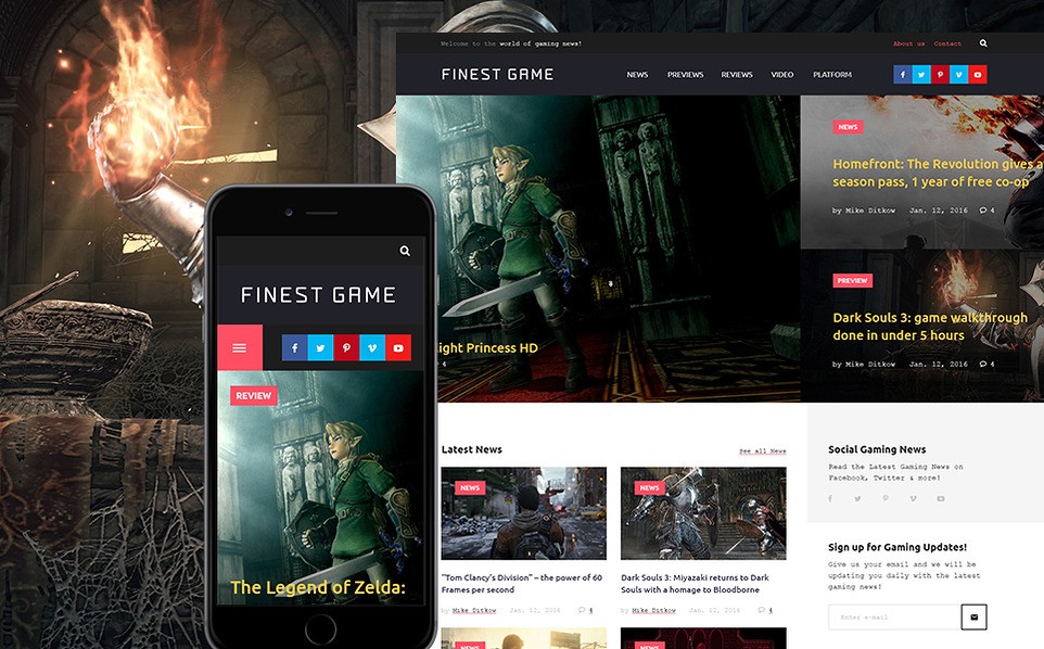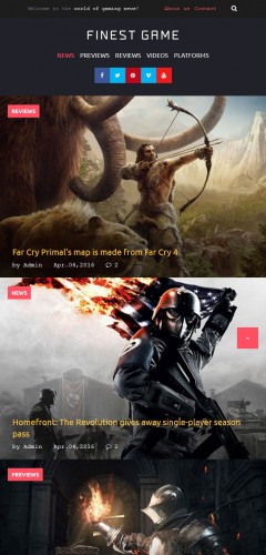 This is a WordPress magazine theme which could become a stunning basis for a game-related website. It's dark, informative and totally game-like. The blocks of information are positioned so that every section of the website is noticed. The grid layout, red buttons, awesome typography and social media buttons are those design elements, thanks to which readers will enjoy their experience on the website. They won't help signing up via a clean-designed signup form and checking out the popular posts of the website. Although this WordPress magazine template implies a lot of text and images, all the content is separated into the blocks and a visitor's perception takes it as a clear system of posts. Use it for any magazine project and enjoy the result!