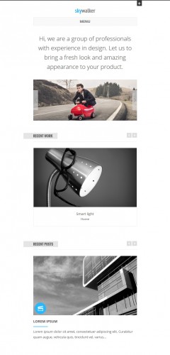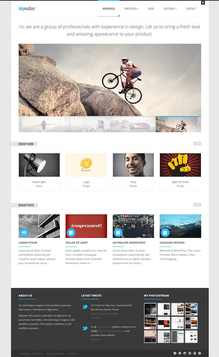 SkyWalker is a Premium WordPress Theme with responsive, clean and minimalist layout. It is packed with many image sliders with beautiful transition effects to help you highlight your recent works and projects.