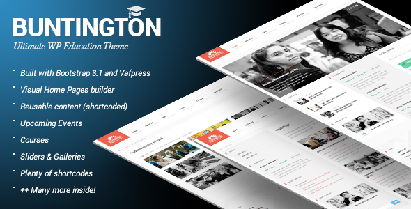 Buntington – school – university – education WP theme. Ultimate and plugin-less solution for any type of school, education or a non-profit organization. It was built with Bootstrap (3.1) and Vafpress framework which guarantees great user and further development/customization experience.