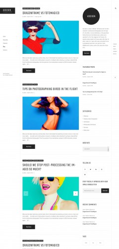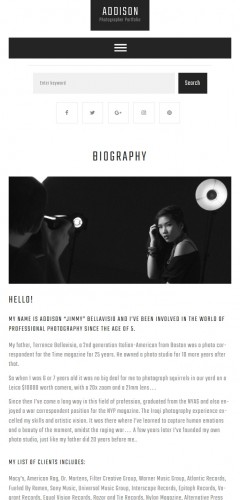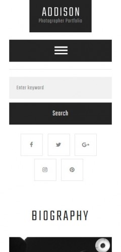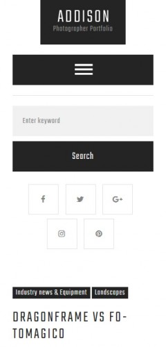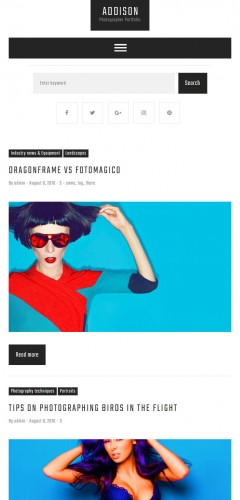 Addison is a modern WordPress theme meant to build a creative photographer portfolio. It runs on Cherry Framework, which provides easy installation, customization, and content management. One of its plugins, Cherry Projects, allows you to showcase your works in a stylish gallery. In an intuitive admin panel, you can set the layout type, pagination mode, and animation effects. In addition to images, the plugin supports audio and video formats. It will let you engage viewers with your projects.The theme also features an easily manageable photo grid. With its help, you can display images by categories or tags. To adapt your online portfolio to your personal style, there is a live customizer. The tool is rather convenient, as it enables you to preview each change without saving it and reloading the page. Built with Bootstrap 3 Framework, Addison automatically scales to any display. In that way, visitors can browse your photo gallery via desktops, tablets, and smartphones. No matter what device they use, the screen image will look the same well.