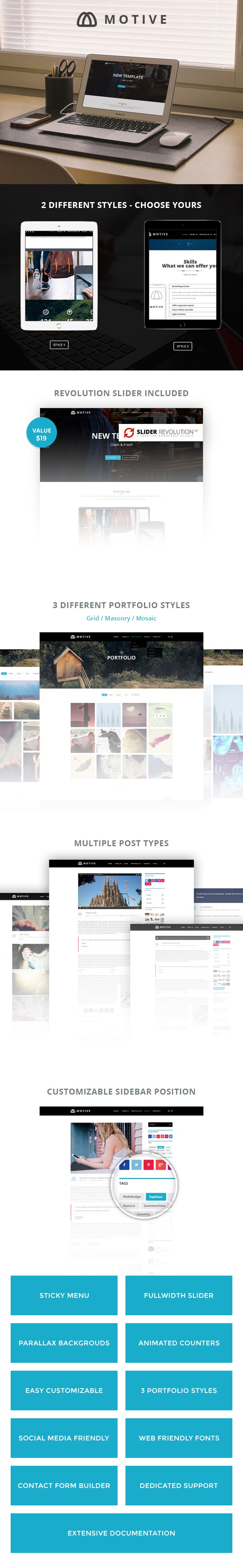 Motive is a clean, modern, creative WordPress Theme with lots of advanced features and a beautiful portfolio with various representations (grid, masonry, mosaic). It can represent your blog, online portfolio, agency, business site or any other similar project.