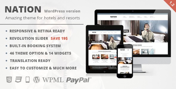 ---- version 1.2.3 (19/05/2016) ---- -Update: build-in Revolution Slider plugin to the latest version 5.2.  ---- version 1.2.2 (25/04/2015) ---- -Update: build-in TGMPA and Option Tree plugins to the latest versions to resolve recently found security vulnerability with add_query_arg() and remove_query_arg() functions  ---- version 1.2.1 (09/05/2014) ---- -Update: build-in Revolution Slider plugin was updated to the latest v4.6.  ---- version 1.2. (08/25/2014) ---- - New: You can now create discount coupons on the reservation form - New: You can edit reservation info through backend - New: Language Menu was recreated by using WPML API - New: Added wpml-config.xml file in the theme's root folder - New: Form field validation to the single-room's page form - New: Nation child theme template - Fix: Bug with date format selection on the main page reservation widget and on the single rooms page - Fix: Date translation issue on the reservation form - Fix: single-rooms.php page issue with description and feature tabs hide if users hide a page's title. - Fix: several other small bugs that were reported by users  ---- version 1.1. (05/08/2014) ---- New: WPML support  New: Online Reservation widget on the main page  Update: Significantly improved Ajax requests speed of the availability calendar Update: WordPress 3.9 officially supported Update: Nation Shortcode Selector now supported new TinyMCE 4 API;  Update: Fixed wpdb->prepare() error that started to show in WordPress 3.9 due to some errors in it's syntax; - Fixed bugs in footer_text and footer_social_network widgets; Fix: Few small bugs in reservation.php file. Fix: Bug with the availability calendar stop working if user click on some date in it and then try to change month. Fix: Deleted some unnecessary wpdb->prepare() calls Fix: Bug in footer-text-widget  New: PayPal payment gateway option (now you can automatically charge customers when they fill reservation form) Fix: Some style issues that shows on iPad Fix: Bug with the availability calendar stop working if user click on some date in it and then try to change month.